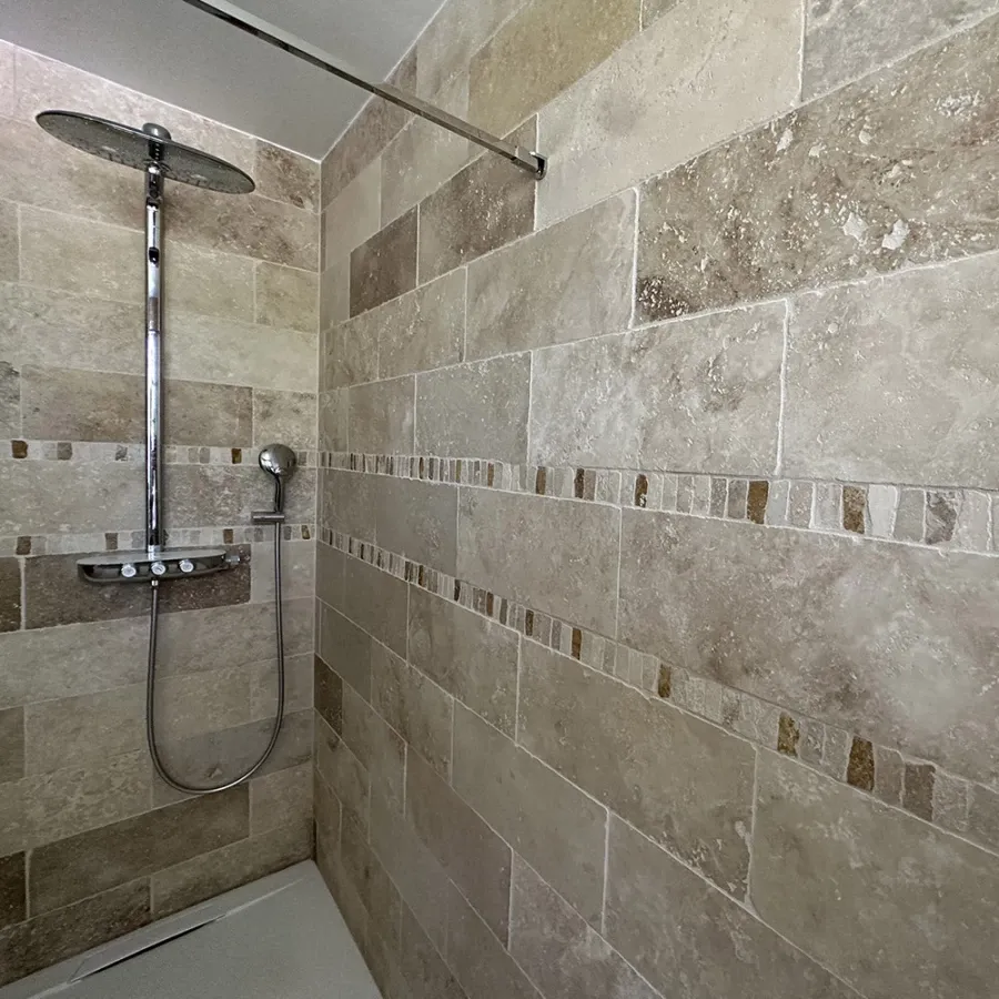 Le travertin, une pierre calcaire naturelle, est particulièrement prisé pour ses teintes chaleureuses et son aspect authentique. Disponible dans une large gamme de finitions – vieillies, adoucies ou brossées – il s'intègre parfaitement à tous les styles, du rustique au contemporain. Nos carreaux en travertin, soigneusement sélectionnés, offrent une surface antidérapante et résistante, parfaite pour les terrasses, piscines ou salles de bain. Grâce à ses propriétés isolantes naturelles, le travertin garantit un confort thermique optimal en toute saison.