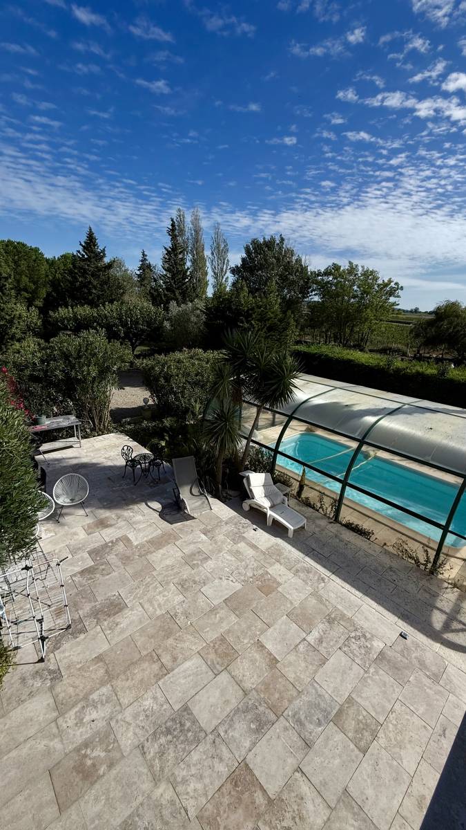 Carrelage en pierre Travertin extérieur pour terrasse et plage de piscine entre Narbonne et Béziers.
