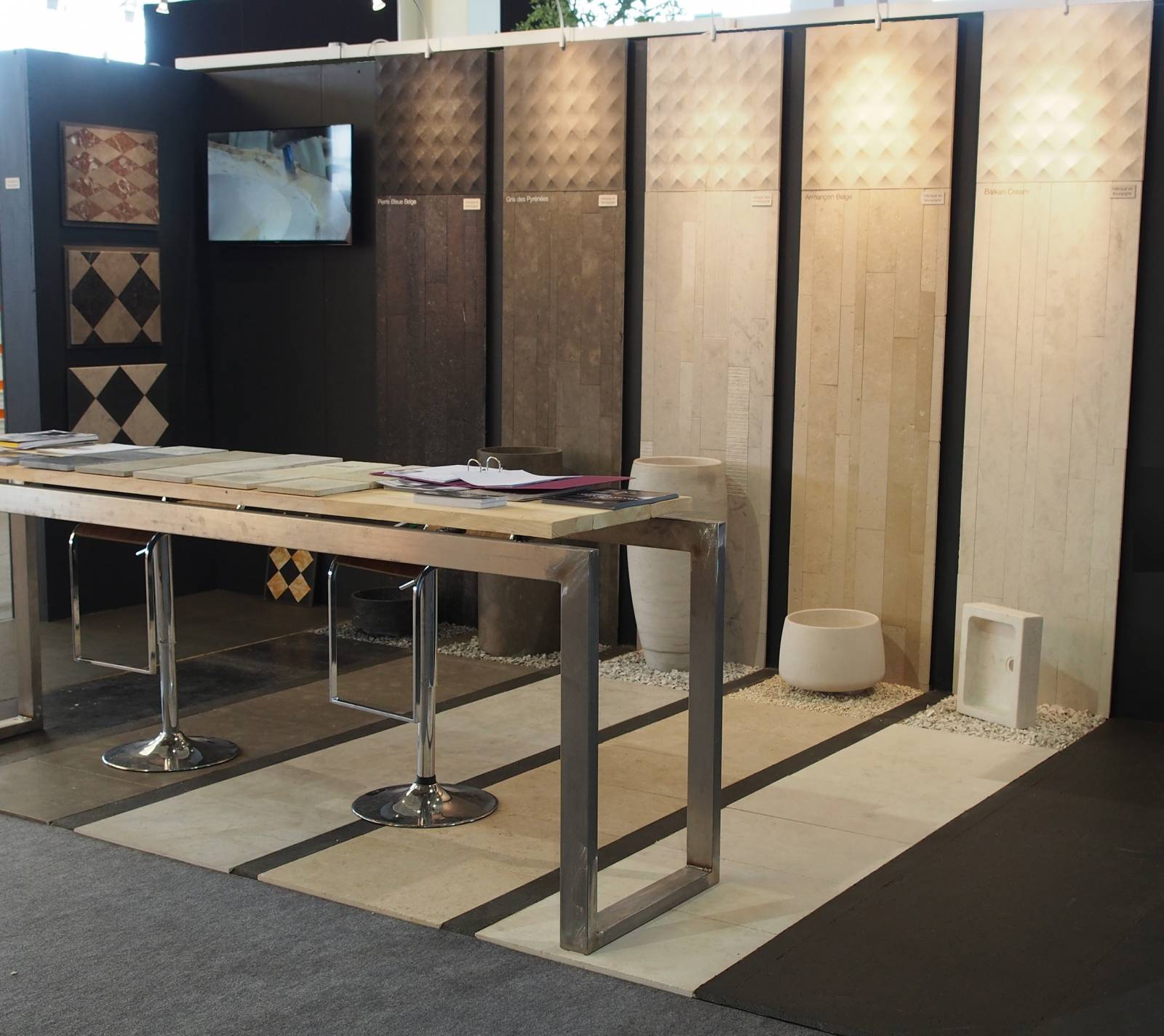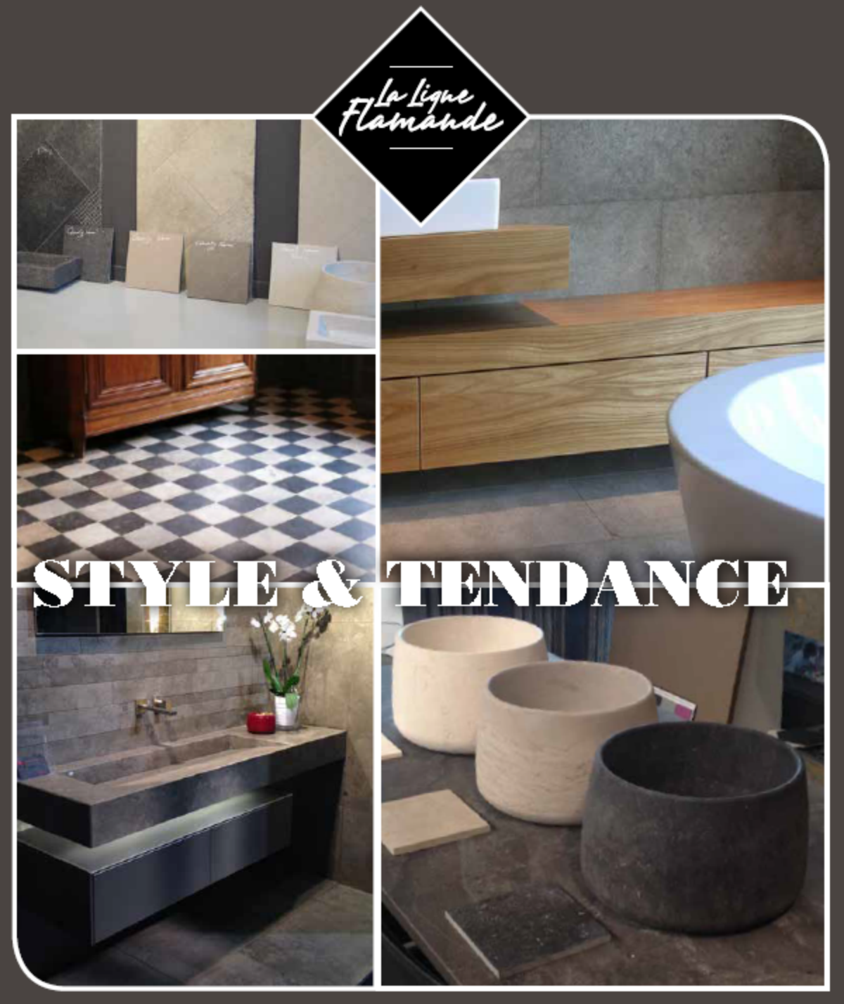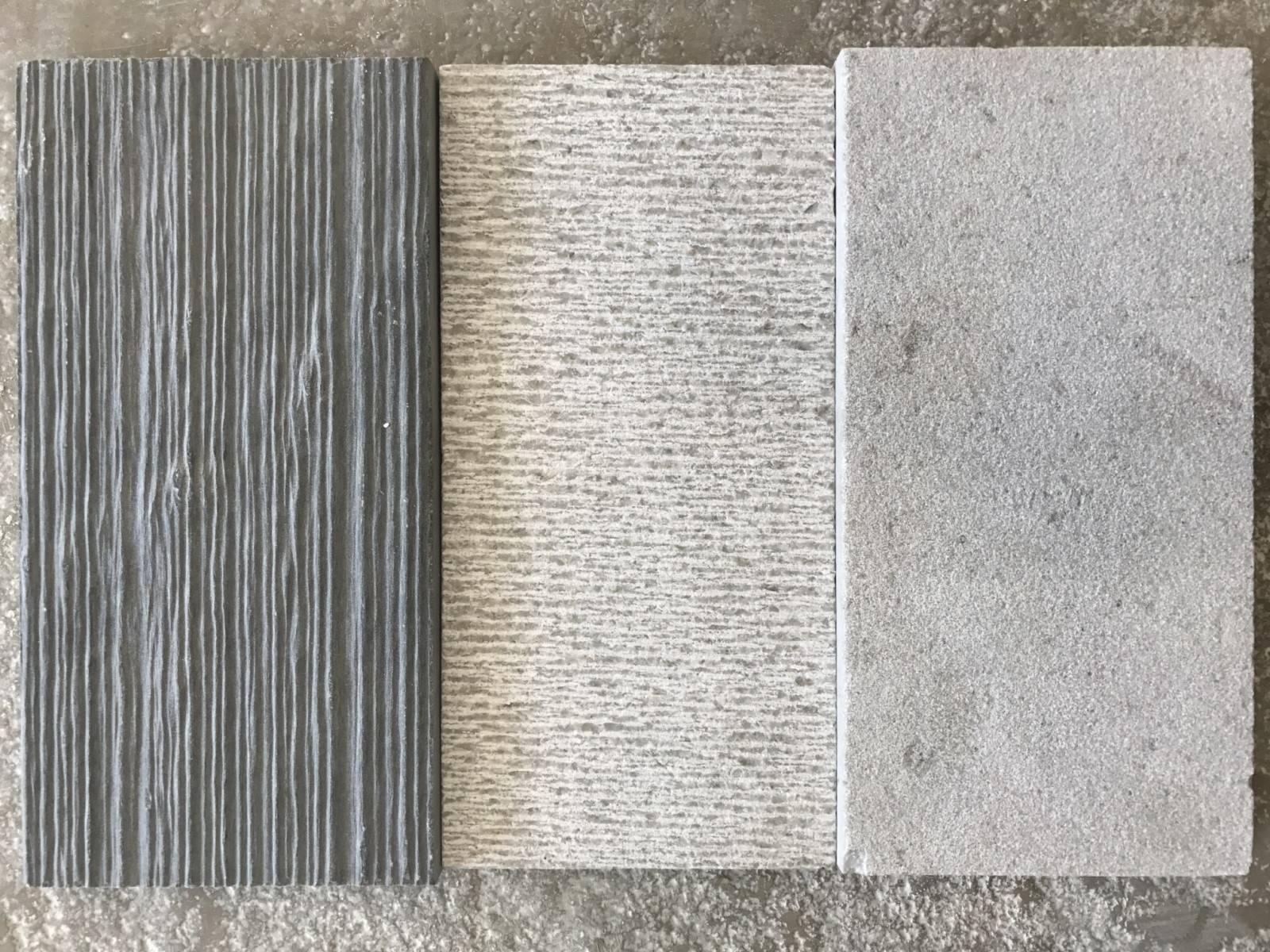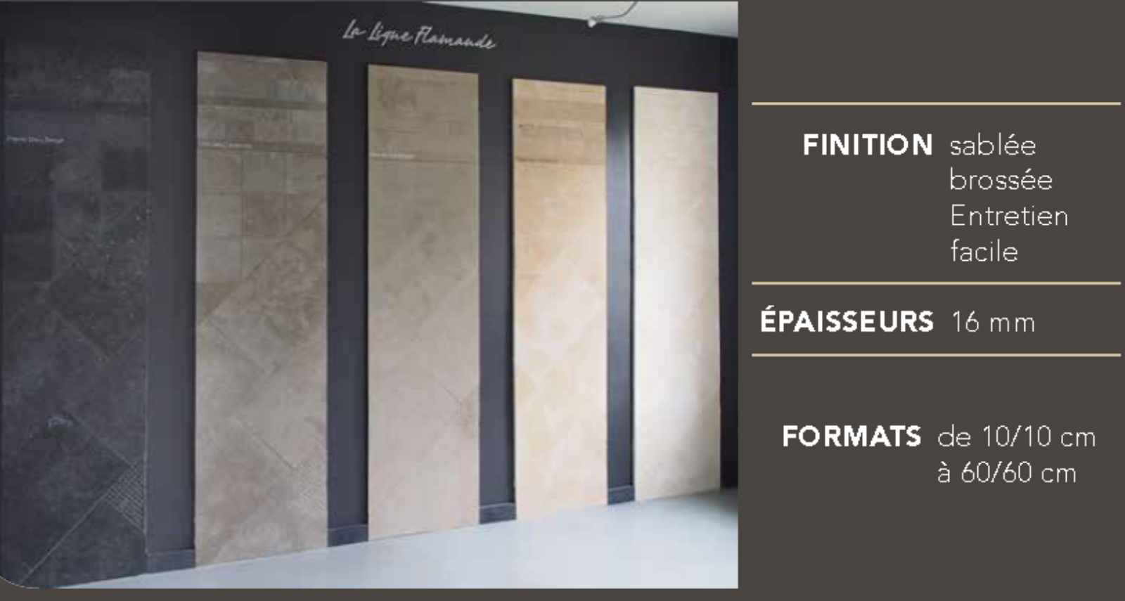 La gamme La Ligne Flamande comprend différents types de pierres, Bleu du Hainaut, Armançon, Massangis, Balkan Cream, Gris des Cévennes, Gris cénia, Marbre blanc de Carrare, marbre noir...