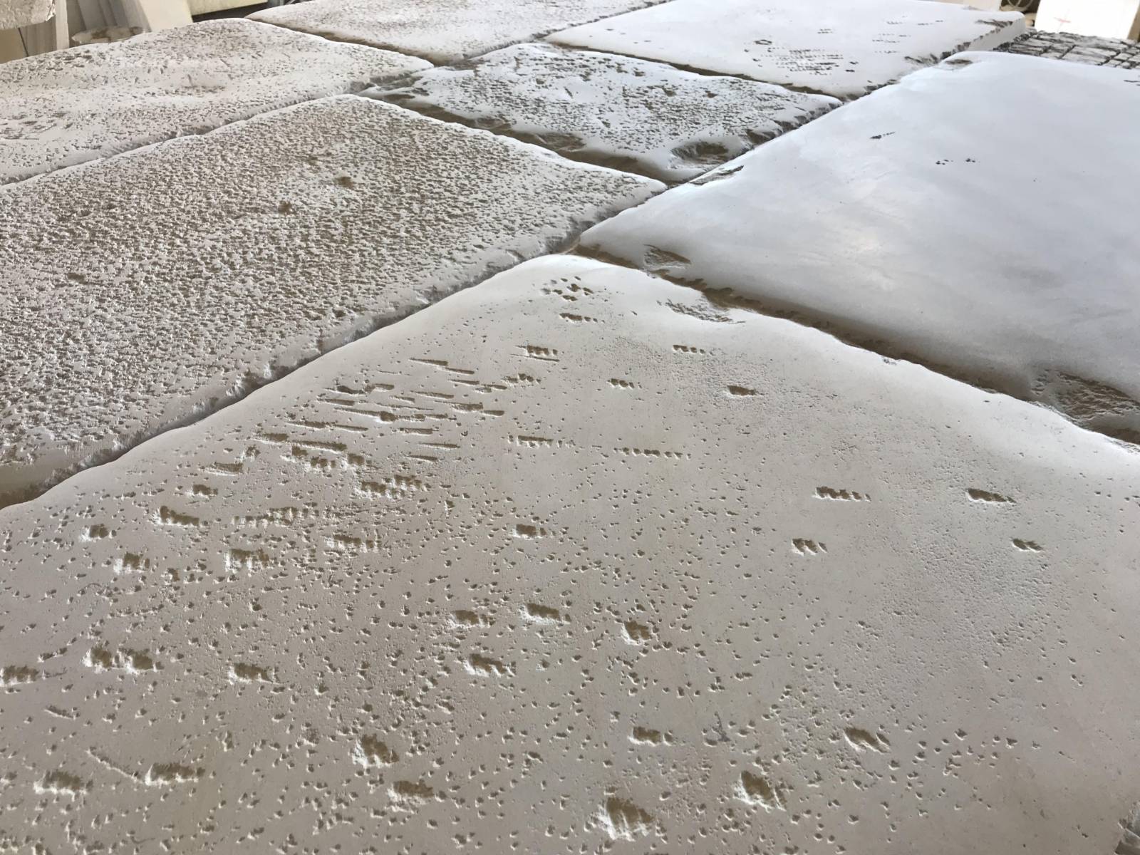 pierre naturelle avec un degré de finition très poussé. La surface de la pierre est bouchardée, brossée, poncée au 60, 120 puis 220, les bords sont bombés, ciselés, ébréchés, usés. La patine est naturelle et aucun produit n’est utilisé. Avec notre savoir-faire et mécaniquement, nous recréons l’usure des vieilles dalles d’église… En bandes longueurs libres, largeur 50cm ou en