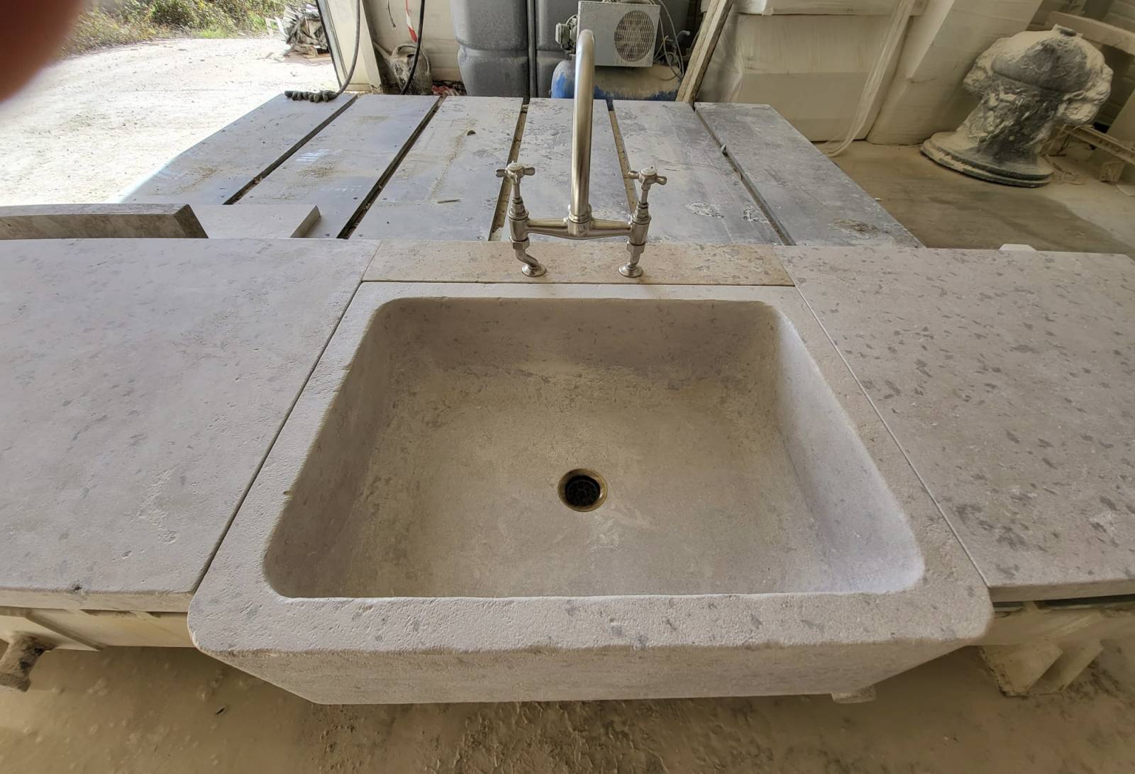 Evier ancien en pierre grise ou beige, patine et façonnage à partir de pierre naturelle par des tailleurs de pierre expérimentés dans le vieillissement naturel des matériaux naturels en pierre calcaire.