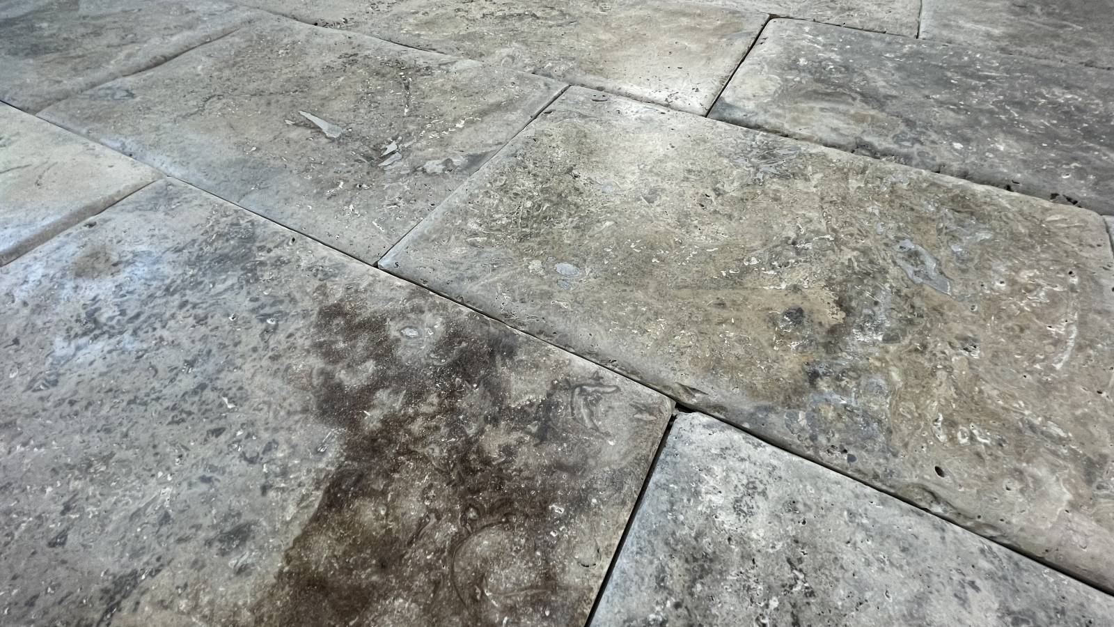intérieur et extérieur ce dallage (matière et finition haut de gamme) en pierre naturelle avec un degré de finition très poussé. La surface de la pierre est bouchardée, brossée, poncée au 60, 120 puis 220. La patine est naturelle et aucun produit n’est utilisé. Avec notre savoir-faire et mécaniquement, nous recréons l’usure des vieilles dalles d’église… En